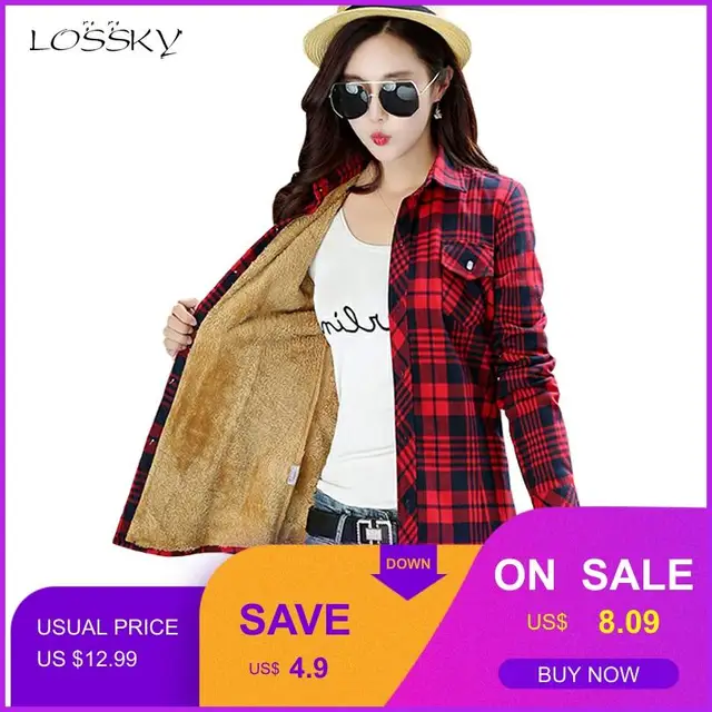 Lossky Winter Velvet Blouse Thick Keep Warm Cotton Shirts Women Long Sleeve Red Plaid Shirt 2018 Fashion Blouse Casual Work Tops