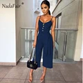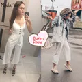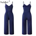 Nadafair Jumpsuits Women Casual Cotton Linen Rompers Womens Jumpsuit 2019 Summer V Neck High Waist Wide Leg Jumpsuits White