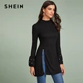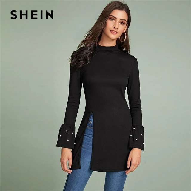 Limited Offer SHEIN Black Beaded Flounce Sleeve Side Slit Tee Women Spring Autumn Long Sleeve Stand Collar Solid with Free Shipping Worldwide!