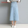 New Style Women Casual Straight Denim Midi Skirt Spring Summer With Pocket Slit High Waist Mid-Calf Femininas Skirts