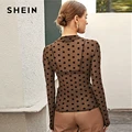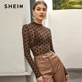 Cheap Offer SHEIN Stand Collar Brown All Over Geometric Print Top Without Bra Women Spring Long Sleeve Mesh Lad with Free Shipping Worldwide!